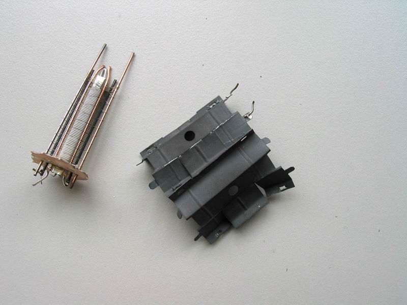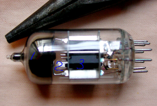 这是颗用于高频放大的通用双三极管6N1。1是吸气剂;2是灯丝阴极和栅极的组合体;3就是阳极。