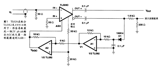三、自动增益控制TL026在一个8脚封装里提供差分输入与差分输出,它有50MHZ频宽、38dB最大增益及50dB的AGC范围,在其AGC针脚相对于参考针脚有±180MV的电压变化时,就会令其增益从最小变至最大——图5。